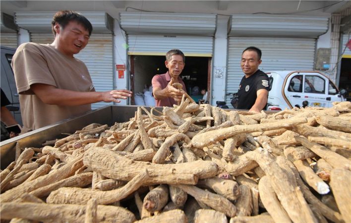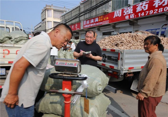 亳州高新区十九里镇药材街上,药农在交易白芍。